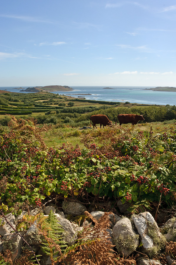 Field margin of Bramble (Blackberry) ripening fruit (Rubus fruticosus agg.), and Bracken (Pteridium aquilinum), looking towards St Martin's Vineyard, St Martin's, Isles of Scilly, September