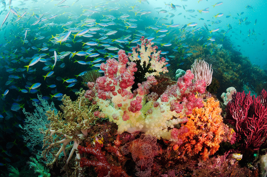 Yellow and blueback fusiliers (Blue and gold fusiliers) (Caesio teres) schooling over coral reef, with soft corals Triton Bay, near Kaimana, West Papua, Indonesia, March 2017 Aquarium