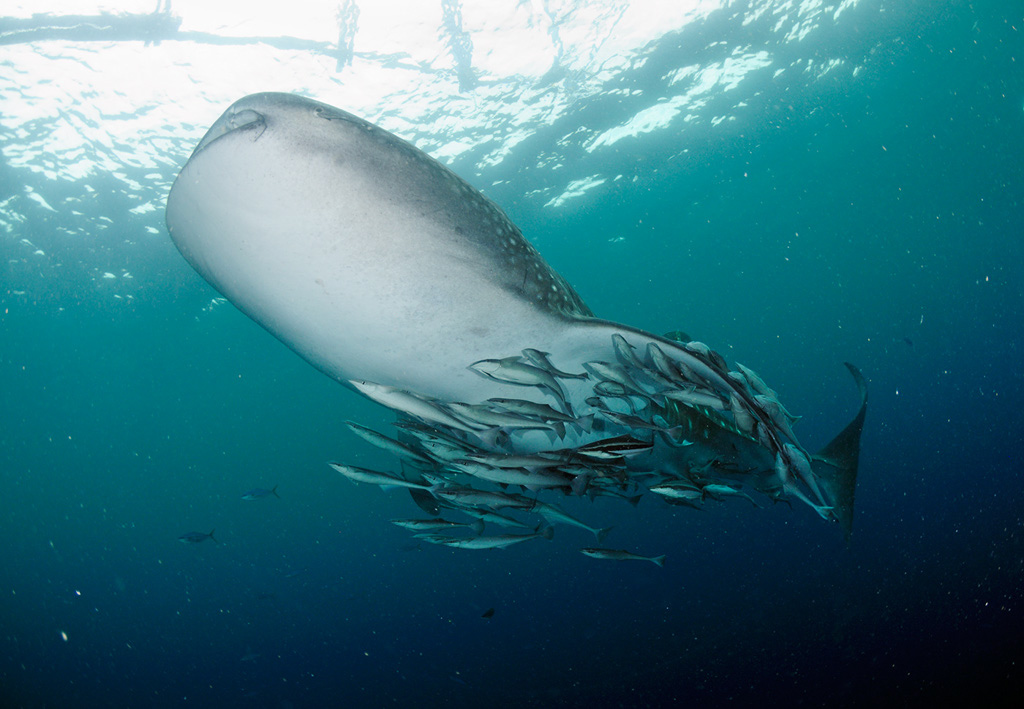 Whale shark (Rhincodon typus), with remoras - Sharksuckers (Echeneis naucrates), by a bagan. S. of Mai Mai, between Triton Bay and Kaimana, West Papua, Indonesia, February 2017